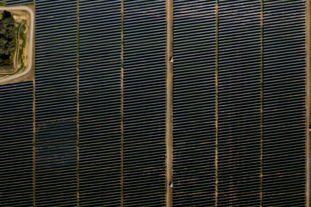 The solar panels are typically 1.2 meters (m) x 2.4 m in size and are arranged in rows. These rows of solar panels are spaced 5m to 7m apart. The height of a fully tilted solar panel is 3m to 4m above the ground.